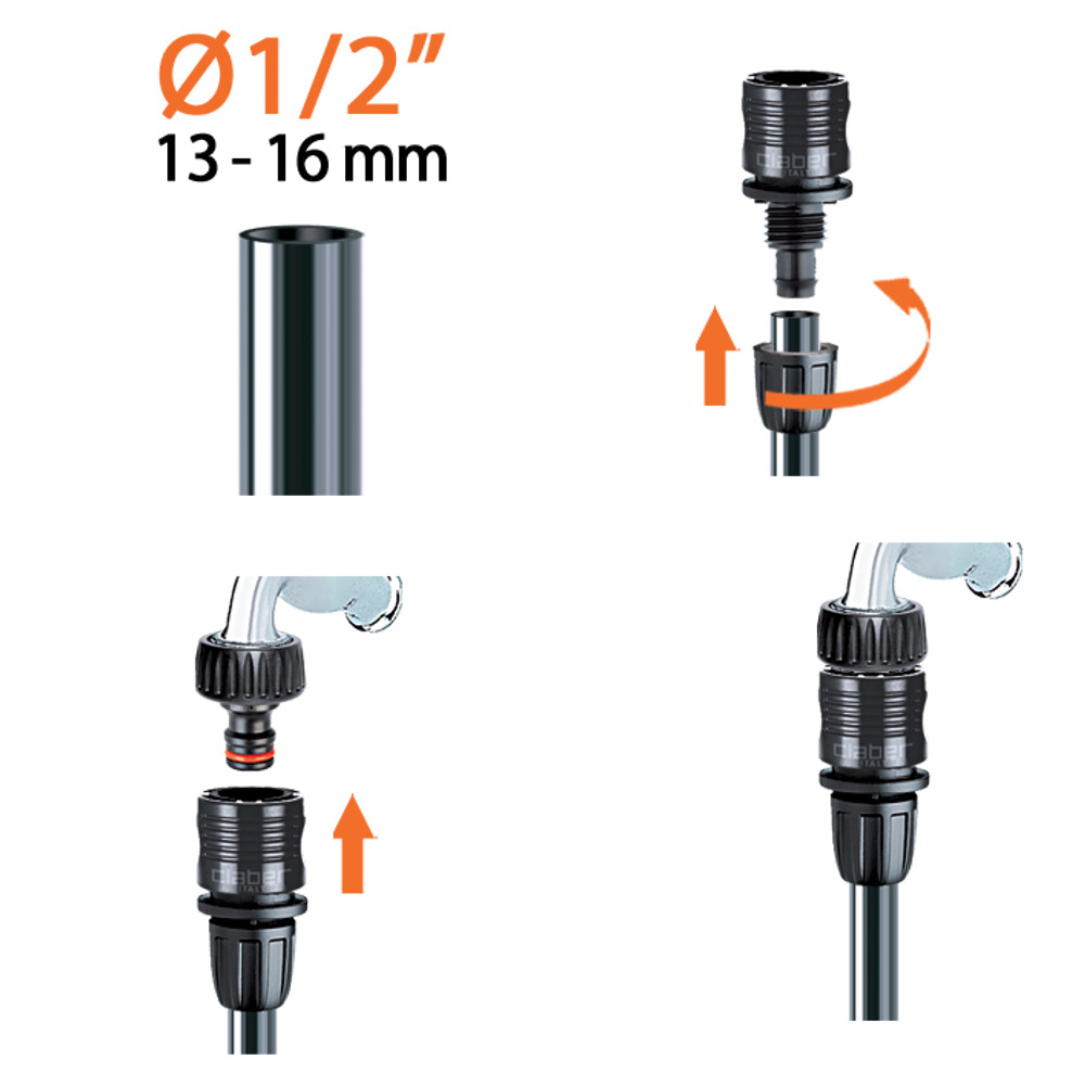 Si usa per collegare il tubo collettore da 1/2” (13 – 16 mm) alla presa con attacco rapido montata sul rubinetto.